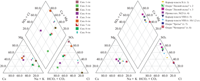 На основании анализа трендов изменения минерализации и компонентного состава подземных вод в пределах горных отводов можно сделать вывод о постепенной стабилизации химического состава: максимальные значения минерализации подземных вод не превысят 3.0–3.7 г/дм3, сульфат-иона – 1.5 –2.0 г/дм3, общей жесткости – 30 мг-экв/дм3 (рис. 9а). В поверхностных водах затопленных провалов, карьеров и разрезов ожидаемые значения показателей составят: минерализация 3.2–4.8 г/дм3, концентрация сульфат-иона 1.3–3.0 г/дм3, хлорид-иона до 0.5 г/дм3 (рис. 9б). Воды останутся очень жесткими (до 40 мг-экв/дм3), нейтральными или слабощелочными.
