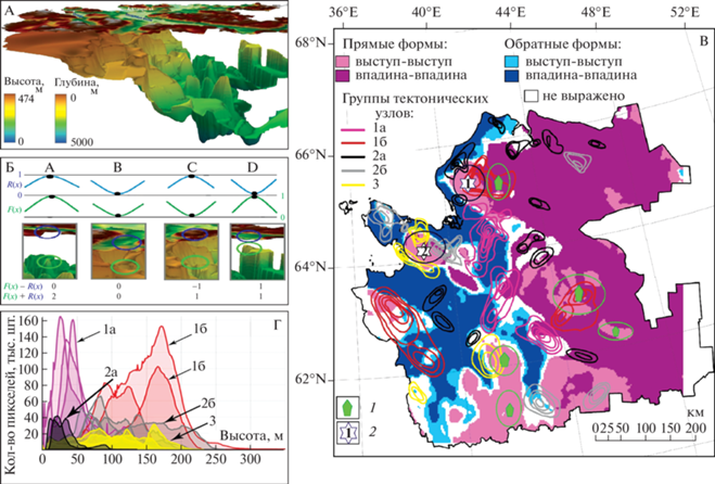 Разделение тектонических узлов по эндогенным и геоморфометрическим параметрам. А – 3D сопоставление цифровых моделей рельефа и фундамента на территории Архангельской области; Б – разность и сумма нормированных значений функций: A, B – прямые (повторяющиеся); C, D – обратные (противоположные) формы; В – сопоставление форм наследования структур фундамента в современном рельефе и геоморфометрических параметров тектонических узлов с проявлениями кимберлитового магматизма и участками условной вероятности встречи нефтяных и газовых месторождений по неотектоническим данным на площади Мезенской синеклизы: 1 – районы вероятных локализаций нефтяных и газовых месторождений; 2 – районы кимберлитового магматизма: 1 – Зимнебережный кимберлитовый район, 2 – Ненокское и Белозерское поля мелилититов и кимберлитов; Г – распределение высот в группах тектонических узлов: 1 – узлы большой площади, высоты: 1а – до 150 м, 1б – до 350 м; 2 – узлы средней площади, высоты: 2а – до 100 м, 2б – до 250 м; 3 – узлы малой площади.