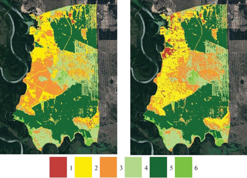 При построении картосхемы ключевого участка применялись два способа: первый – применение полуавтоматической классификации с обучением (SC) по эталонным участкам; второй – полуавтоматическое дешифрирование по нормализованному вегетационному индексу (NDVI).