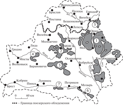 Основные районы распространения лессовых и лессовидных грунтов на территории Белоруссии [9]: 1 – Оршанско-Могилевский; 2 – Минский; 3 – Слуцкий; 4 – Новогрудско-Кореличский; 5 – Лиозненский; 6 – Мозырско-Хойникско-Брагинский; 7 – Туровский.