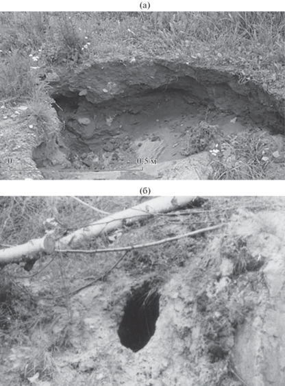 Суффозионные формы рельефа: а – ниша на склоне оврага Гапеевский в г. Витебск; б – колодец в вершине оврага в г. Мозырь Гомельской обл., с диаметрами входного отверстия 0.5–0.8 м, донной части – 1.2–1.7 м и глубиной 2.8 м (фото А.Н. Галкина, 2008; А.И. Павловского, 1993).