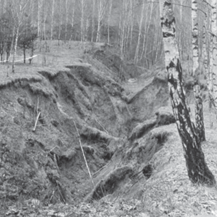 Овраг на склоне балки в урочище “Булавки” Мозырского района Гомельской обл., сформировавшийся в результате провалов над суффозионными каналами (фото А.И. Павловского, 1993).
