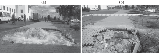 Прорыв водопроводной трубы, вызвавший суффозионный размыв грунта (а), и его последствия вблизи Ледового дворца в Гомеле, 2013 г. (б) [6].