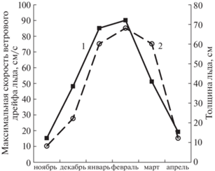 Изменение максимальной скорости ветрового дрейфа льда (1) и толщины льда (2) по месяцам года.