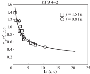 В качестве примера на графике для грунтов ИГЭ 4–2 приведены значения${{\tau }_{{{\text{cy}}}}}{\text{/}}\tau _{s}^{*}$, полученные при воздействиях с разной частотой (рис. 4).
