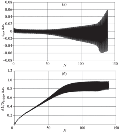 Характерные диаграммы записей результатов длительных экспериментов: а – развитие циклических деформаций сдвига ${{\varepsilon }_{{{\text{су}}}}}$ по циклам нагружения $N$; б – то же для относительного порового давления $\Delta U{\text{/}}{{\sigma }_{{{\text{1эфф}}}}}$.