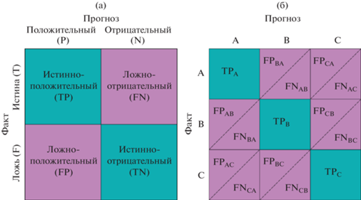 Для мультиклассификации результат может быть расценен как положительный, когда спрогнозированный класс совпал с фактическим (TPA, TPB, TPC), либо как отрицательный с указанием ошибочно присвоенного класса (рис. 1б). Например, результат FPCB означает, что при работе алгоритма машинного обучения объекту выборки был ошибочно присвоен класс C при фактическом B.
