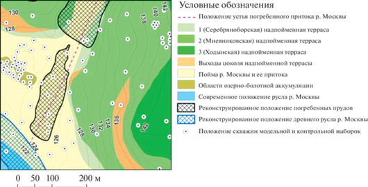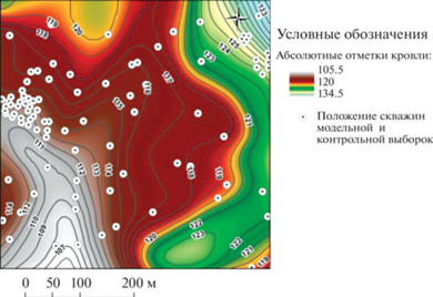 Рассмотрим процедуру оценки качества с применением метода кросс-валидации на примере участка в центральной части Москвы. Участок репрезентативен для оценки, потому что характеризуется высокой степенью инженерно-геологической изученности и изменчивостью инженерно-геологических условий. На участке выделяется 7 геоморфологических элементов, включая пойму р. Москвы и ее погребенного притока (рис. 2), а рельеф дочетвертичных отложений характеризуется высокой расчлененностью, так как участок приурочен к борту доледниковой долины (рис. 3).