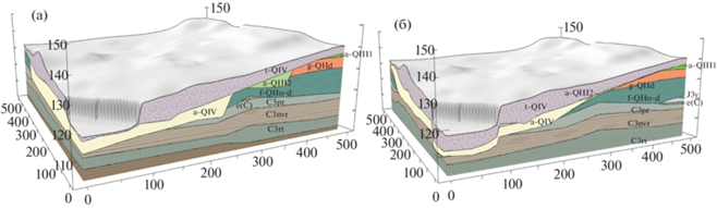 Визуальная оценка результатов моделирования показывает общее структурное сходство построенных моделей, хотя и с локальными расхождениями. Например, на моделях, представленных на рис. 4, расхождения могут быть выявлены в части пространственной характеристики толщи техногенных отложений, смыкания речных террас, выявленных выветрелых зон в кровле каменноугольных отложений и конфигурации толщи верхнеюрских отложений. Отметим, что все результаты прошли проверку на соответствие входным данным, и расхождения проявляются в не обеспеченных входными данными блоках пространства моделей.