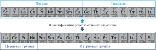 Редкоземельные элементы представляют собой группу из 17 элементов, в которую включены 15 элементов лантаноидов (порядковые номера 57–71 ряд La–Lu), а также скандий и иттрий, имеющие порядковые номера 21 и 39 соответственно. Данная группа элементов характеризуется схожими химическими и физическими свойствами и достаточно близкими значениями молекулярных масс, что предопределяет сложность их селективного извлечения. Одной из наиболее распространенных классификаций РЗЭ считается разделение их по конфигурации электронов на цериевую и иттриевую группы. Существует также классификация редкоземельных элементов по атомному весу на легкие и тяжелые (фиг. 1).