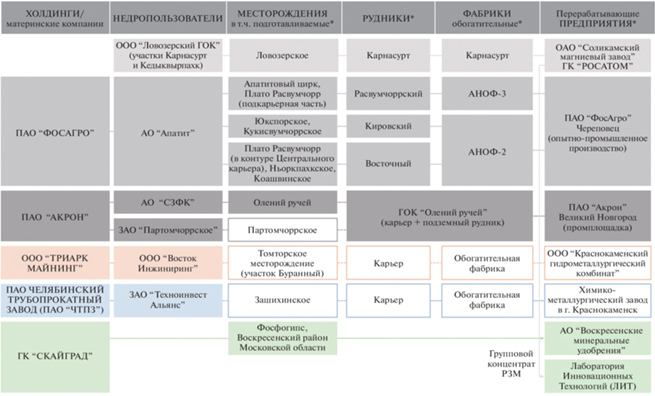 Основными месторождениями редкоземельных элементов РЗЭ в России являются: Ловозеровское, Томторское, Умбозерское, Чинглусуайское, Аллуайвайское, Белозиминское, Селигдарское и др., однако количество месторождений, вовлеченных в эксплуатацию, значительно меньше. Извлечение редкоземельных элементов из комплексного сырья состоит преимущественно из основных этапов: обогащение, химическая переработка, разделение, рафинирование и очистка, которым предшествует непосредственно разведка месторождений и добыча сырья. В табл. 1 представлены основные действующие и проектируемые предприятия переработки месторождений РЗЭ. Структура редкоземельной промышленности РФ приведена на фиг. 2.
