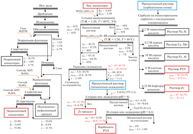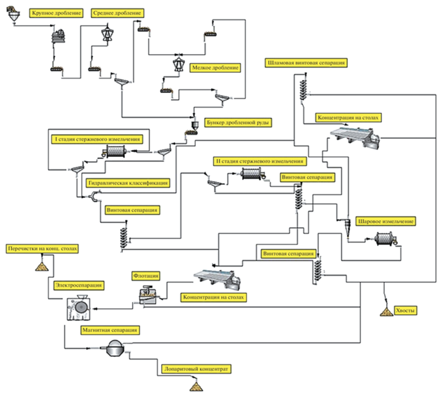 Проблемам переработки руд Ловозерского месторождения посвящены работы (Чантурия и др., 2019б; Chanturia et al., 2017), направленные на переработку эвдиалитового концентрата, в том числе с применением энергетических воздействий. Принципиальная схема обогащения Ловозерских руд представлена развитой гравитационной схемой, основные операции которой реализованы с применением винтовых сепараторов, а перечистные операции с применением концентрационных столов. Электромагнитные и флотационные методы обогащения применяются для доводки чернового концентрата (фиг. 3).