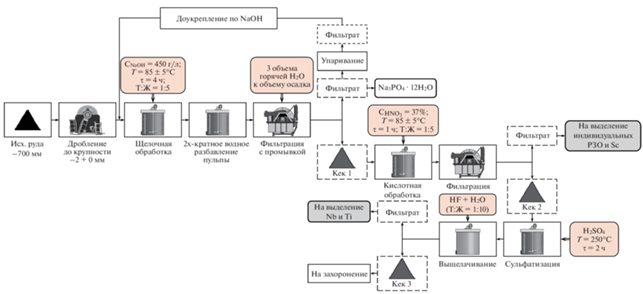 В работах (Елютин и др., 1995; Косынкин и др., 2105; Кузьмин и др., 2006) приведена технология автоклавно-щелочного вскрытия продуктов. После вскрытия проводится кислотное выщелачивание полученного кека с переходом в раствор РЗЭ, тогда как ниобий не переходит в жидкую фазу.