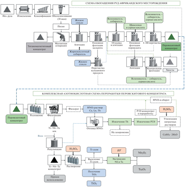 АО “Аркминерал-Ресурс” на базе Африкандского месторождения перовскит-титаномагнетитовых руд (Мурманская область) реализует проект по получению и переработке перовскитового концентрата. Планируемая продукция – пигментный диоксид титана, концентраты РЗМ, пентаоксиды ниобия и тантала, титаномагнетитовый концентрат. При производительности ~1 млн т/год руды будет получен перовскитовый концентрат – 190 тыс. т/год, основными продуктами переработки которого являются (тыс. т/год): пигментный TiO2 90, карбонаты РЗМ (в пересчете на Ln2O3 – 2.25, Nb2O5 – 0.9, Та2О5 – 0.027).