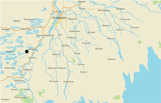 Карта-схема района отлова (⚫) леща Abramis brama и серебряного карася Carassius gibelio в дельте р. Волга (рукав Хурдун) в сентябре 2021 г.