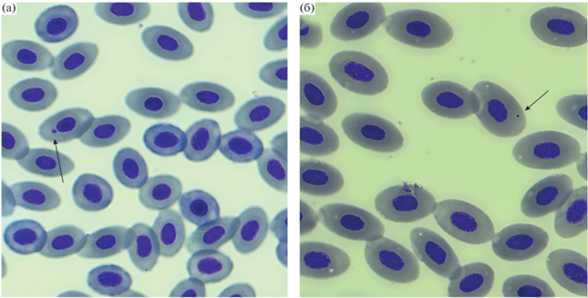 Окрашивание мазков для определения количества МЯ проводили методом Романовского–Гимзы (Hoofman, Raat, 1982). Препараты анализировали на микроскопе Carl Zeiss Axioscope 5 (Германия). В каждом препарате просматривали 1000 эритроцитов, затем вычисляли частоту встречаемости эритроцитов с МЯ – отношение числа клеток с МЯ к общему числу просмотренных клеток, ‰ (Schmidt, 1975).