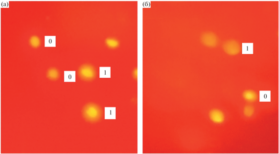Оценка цитогенетической картины эритроцитов леща Abramis brama (а) и серебряного карася Carassius gibelio (б) дельты р. Волга методом ДНК-комет в сентябре 2021 г. 0, 1 – степень повреждения клеток.