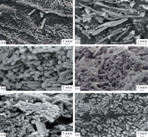 На поверхности слизистой слепой кишки видны открытые крипты (рис. 2); слизистая вокруг устьев крипт образует концентрические складки. Микробиота слизистой слепой кишки представлена у всех песчанок в основном веретеновидными бактериями и кокками, у G. andersoni встречаются нитевидные бактерии. В ободочной кишке наибольшая плотность бактерий наблюдается на поверхности слизистой мезентериальной стенки, а на косых складках бактерии сконцентрированы в устьях крипт (рис. 3). У P. obesus микробиота ободочной кишки разнообразнее по сравнению с микробиотой преджелудка и слепой кишки. У этого вида в ободочной кишке преобладают крупные (4–5 мкм) бациллы и изогнутые палочковидные бактерии, у M. crassus – веретеновидные бактерии и кокки. У трех видов Gerbillus слизистая колонизирована наиболее разнообразными по форме бактериями; у G. andersoni и M. crassus встречаются еще и очень крупные (>19 мкм) палочковидные бактерии.