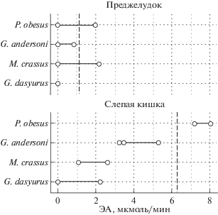 Эндоглюканазная активность (ЭА) в преджелудке и слепой кишке песчанок P. obesus, G. andersoni, M. crassus, G. dasyurus. Вертикальной штриховой линией показаны медианы значений ЭА серых полевок Microtus sp.