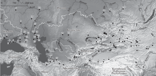 Характеристика образцов, использованных в работе: локалитет/размер выборки/гаплотипы по рис. 3/номера доступа для последовательностей из ГенБанка (последовательности, полученные авторами ранее, отмечены звездочкой). 1 – Украина, Одесса/2/h1/HM586992*, HM586991; 2 – Украина, Николаев/3/h14; 3 – Крым, Севастополь/h4/AY843475; 4 – Крым/8/h8, h10, h15; 5 – Крым, Феодосия/1/h10/AY994377; 6 –Московская обл./2/h2; 7 – Краснодарский край/1/h7/AY843476; 8 – Ростовская обл., Азов/1/h7; 9 –Воронежская обл./2/h2/EU742609*, EU742610*; 10 – Ростовская обл./1/h14; 11 –Ростовская обл., Сальск/1/h10; 12 – Ставрополь/1/h5/AY843467; 13 – Ростовская обл., Цимлянск/2/h13; 14 –Пензенская обл./1/h1; 15 –Калмыкия/7/h10, h9, h13, h14; 16 –Астраханская обл., пески Шкили/2/h17, h12; 17 –Саратовская обл., с. Дьяковка/2/h16; 18 –оз. Баскунчак/1/h17/AY994386*; 19 – Астраханская обл./1/h74/AY843477; 20 – Астраханская обл./8/h11, h12, h7, h6, h10, h26, h3; 21 –Астраханская обл., Досанг/2/h10/EU742613*; 22 – респ. Татарстан, Казань/1/h14/AY843483; 23 – Иран, Мазандаран/1/h24/DQ630063; 24 – Иран, Голестан/1/h44; 25 – Туркменистан/h39/AY843466; 26 – Иран, сев. Хорасан, п. Даркаш/1/h43; 27 – Туркмениcтан, Фирюза/1/h40/AY843481; 28 – Иран, Мешхед/1/h41/DQ630062; 29 – Казахстан, Кызылординская обл./1/h18; 30 – Туркменистан, Бадхыз/1/AY843479; 31 – Казахстан, Карагандинская обл./1/h19; 32 – Туркменистан, Керки/1/h37/AY843480; 33 – Таджикистан, р. Сарытаг/h34, h36; 34 – Узбекистан, Гиссарский хр./2/h31/EU742612*; 35 – Таджикистан, Пенджикент/1/h31/AY843478; 36 – Таджикистан, оз. Искандеркуль /1/h35/AY843482; 37 – Узбекистан, Чаткальский хр./2/h29, h30/EU742611*; 38 – Таджикистан, Похтапор/1/ h33; 39 – Казахстан, Чу-Илийские горы/2/h21, h20; 40 – Казахстан, сев.-зап. Балхаш/3/h23, h22; 41 – Казахстан, сев. Балхаш/1/h28; 42 – Китай, Синцзянь, Ташкурган (Кашгария)/h45, h46/MN690939; 43 – Казахстан, Алма-Атинская обл./1/h24; 44 – Казахстан, Аксуйский р-н/1/h23; 45 – Китай, Синцзянь, Хотан (Кашгария)/1/h52/AY84347; 46 – Казахстан, Алма-Атинская обл./2/h25, h27; 47 – Казахстан, Алма-Атинская обл./1/h12; 48 – Китай, Синцзянь, Аксу (Кашгария)/1/h51/AY843463; 49 – Китай, Синцзянь, Миньфен (Кашгария)/1/h47; 50 – Новосибирск/6/h69, h68, h66, h67/AY843484–AY843486; AB077279, AB077089; 51 – Казахстан, Зайсан, Тассай/3/h17, h69; 52 – Казахстан, Зайсан, Тассай/3/h17, h59; 53 – Казахстан, Зайсан, бугор Айгыркум/3/h17; 54 – Казахстан, Зайсан, Аксуат, /2/h19; 55 – Казахстан, Зайсан, Шакельмес/1/h63; 56 – Казахстан, Зайсан, Тугыл/2/h60; 57 – Китай, Синцзянь, Черчен/3/h48, h50, h49/AY843470, AB077083, AB077084; 58 –Кемерово/1/h64/ AY994389*; 59 – Китай, Синцзянь, Корла (Джунгария)/1/h55/AB077085; 60 – Китай, Синцзянь, Мосован (Джунгария)/2/h58/h62/AB077086, AB077086; 61 – Китай, Синцзянь, Баграш (Джунгария)/1/h56/AY843469; 62 – Китай, Синцзянь, Фухай (Джунгария) /1/h59/AY843464; 63 – респ. Алтай, Телецкое оз./5/h65, h72, h73/EU742583, HM586994, HM586996, HM586995; 64 – Китай, Синцзянь, Дабаньчэн (Джунгария)/1/h63/AY843462; 65 – Китай, Синцзянь, уезд Алтай (Джунгария)/7/h21, h53, h60, h63, h59/MN690935, MN690931, MN690932, AY843462, MN690930, MN690933, MN690934; 66 – Китай, Синцзянь, Фукан (Джунгария)/1/h57/ AY843473; 67 – Китай, Синцзянь, Богдо-Ола (Джунгария)/1/h61/AY843472; 68 – Китай, Синцзянь, Турфан (Джунгария)/1/h54/AY843465; 69 – Монголия, Байтаг-Богд-Уул/1/h10; 70 – Монголия, р. Булган-гол/2/h69, h10; 71 – Монголия, оз. Шаазгай-нуур/1/h71; Монголия, Такин-Шара-нуруу/1/h63; 73 –Красноярский край/2/h69; 74 – Монголия, окр. Гун-Тамга-булаг/7/h70, h71, h63, h69; 75 – Монголия, Говь-Алтай аймак, Шарга/1/h76/AB077088; 76 – Монголия, Барун-Шаргын-Гол/4/h69, h79; 77 – Монголия, Их-Дзармаг/1/h10; 78 – Монголия, Баянхонгор а-л., р. Цаган-Гол, Ба-Цаган/2/h69; 79 – Монголия, Баянхонгор а-к, ю.скл. Баги-Богд-уул/1; 80 – Монголия, оазис Дзулганай/1/ h79; 81 – Китай, Алашань, Эдзин/1/h70/AY843474; Монголия, оз. Орог-нуур/1/h10; 83 – Монголия, Их-Богд-Уул/1/h69/AY99