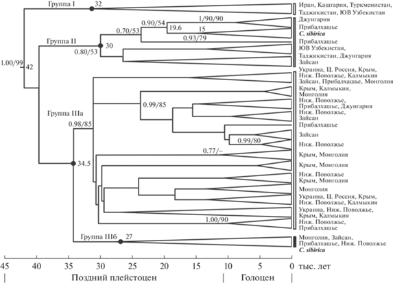 Времена основных событий дивергенции. На рис. 2 показаны времена основных событий дивергенции в группе C. suaveolens/C. sibirica. С учетом принятой скорости дивергенции ~16% за млн лет, последний общий предок всех линий C. suaveolens s.str./C. sibirica существовал 42 тыс. лет назад. Линия C. sibirica, которая обнаруживается внутри группировки II, обособилась 19.6 тыс. лет назад, а ее радиация произошла 15 тыс. лет назад.