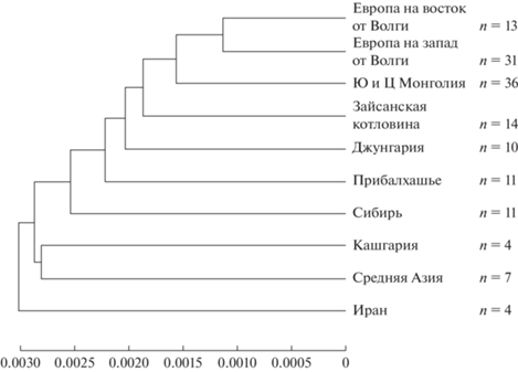 UPGMA-дендрограмма средних попарных p-дистанций между основными выборками. По шкале отложены p‑дистанции, количество образцов в выборках указано рядом с соответствующей ветвью дендрограммы.