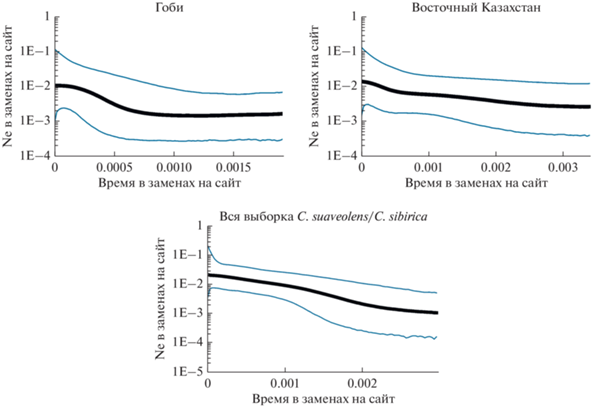 Моделирование изменения эффективной численности во времени (BSP) для группы C. suaveolens s.str./C. sibirica в целом показало на слабый рост, точное время которого по полученной картине установить сложно (рис. 5). Результаты анализа BSP для выборок Гоби и Восточного Казахстана указывают на относительно недавний рост для популяции Гоби и заметно более плавный и существенно более ранний рост в Восточном Казахстане. Получить результаты анализа BSP для выборки из Европы не удалось из-за слишком низкой нуклеотидной и гаплотипической изменчивости. Однако двукратное отличие tau (время в нуклеотидных заменах, табл. 2) в выборках из Центральной Азии и Казахстана по сравнению с Восточной Европой косвенным образом указывает на их больший возраст. Если пересчитать показатель tau в абсолютное время при скорости дивергенции cytb 16% за млн. лет для двух выборок с достоверным ростом (вся Азия и вся Европа, табл. 2), можно получить примерное время расселения. На азиатской территории экспансия была более ранней, ~24 тыс. лет назад, восточно-европейская часть ареала была заселена не более 12 тыс. лет назад, что соответствует концу позднего плейстоцена, началу голоцена.