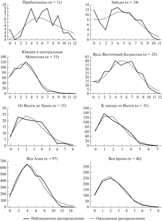 В анализе Mismatch distribution распределение попарных дистанций в суммарной выборке из Восточной Европы и в крупных популяциях из Центральной Азии довольно сходно (рис. 6). Вместе с тем, форма распределения безусловно унимодальна в первом случае (т.е. в Европе не отклоняeтся от ожидаемого, исходя из модели внезапной экспансии), в то время как в крупных азиатских выборках (южная/центральная Монголия, Восточный Казахстан, Азия в целом) наблюдаемое распределение визуально начинает отклоняться от ожидаемого. Наименее гладкую форму распределения имеют выборки из Прибалхашья и Зайсана, хотя их индексы Rg этого не показывают. Деление европейской выборки на подвыборки с левого и правого берега Волги с целью сравнительного анализа сопоставимых по размеру и компактности популяций из Восточной Европы и Центральной Азии не изменило результата.