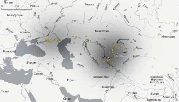 Анцестральный ареал. Реконструкция центра происхождения (рис. 7) показала, что, последний общий предок современных митохондриальных линий малой белозубки мог быть распространен в Средней Азии (кроме юго-запада), а также на территории Казахстана и далее на запад до северного Прикаспия. Наиболее высокая плотность распределения возможных точек происхождения обнаруживается в области от Семиречья до западного Гиссаро-Алая. Область возможного распространения предкового митотипа не включает Монголию, северный Китай, Алтай, Иран, Туркменистан и Причерноморье.