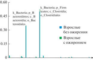 Относительная частота встречаемости представителей различных порядков бактерий, относящихся к микробиоте кала взрослых пациентов с ожирением и без метаболических нарушений, исследованная с помощью методов метагеномного секвенирования с последующей нормализацией и статистической обработкой данных. На гистограмме распределения видно доминирование представителей порядков Clostridiales и Bacteroidales, составляющих филометаболическое ядро микробиоты изучаемой выборки.