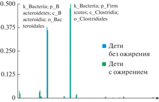 Относительная частота встречаемости представителей различных порядков бактерий, относящихся к микробиоте кала детей с ожирением и без метаболических нарушений, исследованная с помощью методов метагеномного секвенирования с последующей нормализацией и статистической обработкой данных. На гистограмме распределения видно доминирование представителей порядков Clostridiales и Bacteroidales, составляющих филометаболическое ядро микробиоты изучаемой выборки.