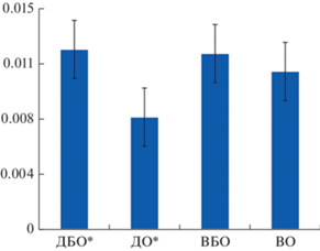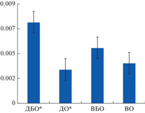 Относительная частота встречаемости бактерий типа Actinobacteria (порядка Coriobacteriales) в микробиоме кала исследованных когорт пациентов. ДБО – дети без ожирения, ДО – дети с ожирением ВБО – взрослые без ожирения, ВО – взрослые с ожирением, * достоверные различия между группами пациентов (снижение содержания представителей типа Actinobacteria (порядка Coriobacteriales) на 37.58 ± ± 22.7% по сравнению с группой ДБО).