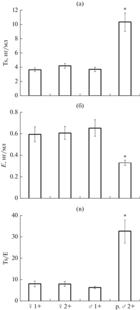 Концентрация половых стероидных гормонов у неполовозрелых особей (самки в возрасте 1+ и 2+, самцы в возрасте 1+), остается на близком уровне (рис. 1). У раносозревающих самцов по сравнению с остальными особями уровень тестостерона повышается почти в 2.5 раза, а эстрадиола-17β, напротив, в два раза снижается. Из-за количественных изменений концентраций половых стероидных гормонов у раносозревающих самцов величина Ts/E возрастает в ~4 раза.