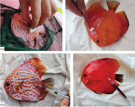 Отбор проб у дискусов. (а) – получение эпидермального секрета, (б) – взятие крови из хвостовой вены.