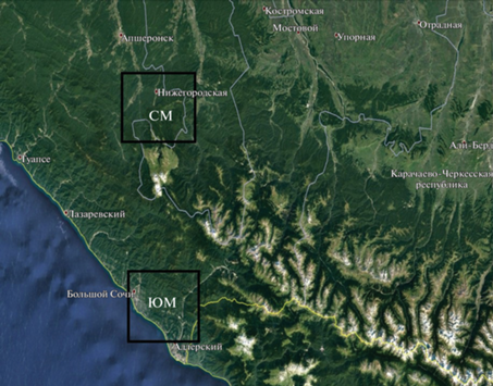 Расположение исследуемых лесных биогеоценозов Западного Кавказа на южном (ЮМ) и северном (СМ) макросклонах Главного Кавказского Хребта.