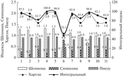 Для сравнительной оценки биогеоценозов рассчитывали интегральный индекс их разнообразия (Iинтегр, %) путем суммирования относительных значений упомянутых индексов (Андреев, 2002):