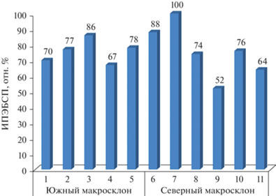Интегральные показатели эколого-биологического состояния (ИПЭБСП, отн. %) бурых лесных почв в биогеоценозах Западного Кавказа; названия биогеоценозов на южном (№ 1–5) и северном (№ 6–11) макросклонах – как в табл. 1.