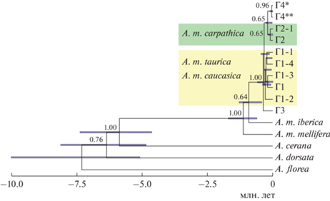 Шкала времени дивергенции представителей рода Apis, построенная на основе фрагмента гена COI мтДНК в программе BEAST v. 2.4. Г4* – гаплотип A. m. ligustica (Генбанк L06178, KX908209, M23409), Г4** – A. m. carpathica (Генбанк AP018403).