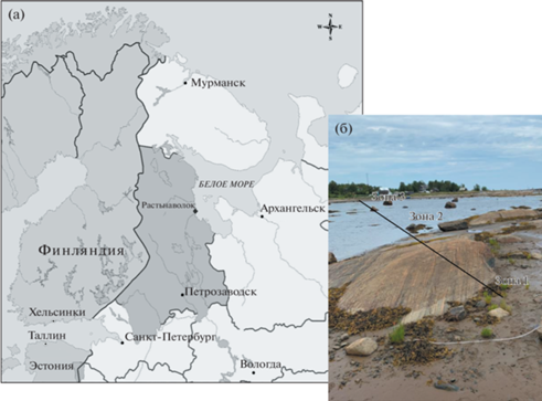Исследование проведено на Поморском берегу западного побережья Белого моря, в окрестностях пос. Растьнаволок Беломорского района Республики Карелия (64°22′81′′ N, 35°93′14′′ E) (рис. 1а) в вегетационный сезон 2021 г.