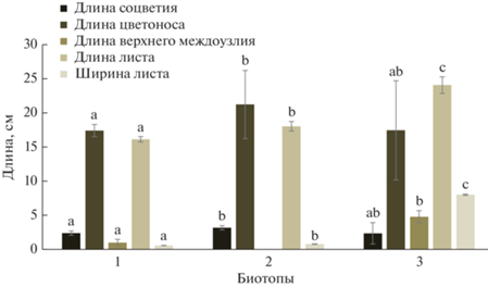 В целом, растения в биотопе 1 отличаются меньшими размерами, чем в биотопе 2, однако значимо не отличаются от растений в биотопе 3. Анализ размеров листьев показал, что в условиях биотопа 1 у растений формируются наименьшие по длине и ширине листовые пластинки, а в биотопе 3 – наиболее крупные листья. В биотопе 2 размеры листьев значимо больше, чем у растений в биотопе 1 и меньше, чем в биотопе 3 (рис. 5).