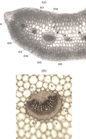 По результатам анатомического исследования у растений в трех биотопах выявлены общие структурные особенности. Так, листья покрыты однослойной эпидермой, у которой кутинизированы наружные стенки клеток, мезофилл характеризуется изолатеральным типом строения, что согласуется с данными литературы (Ianovici, 2011; Карташов, 2013). Палисадный мезофилл расположен в два слоя и на адаксильной, и на абаксильной сторонах листовой пластинки, в центральной части листа формируется до 9–14 слоев водозапасающей паренхимы, ближе к ребрам пластинки количество ее слоев уменьшается и составляет 5–6 (рис. 6а). Механическая ткань – колленхима имеется в ребрах листа и в крупных проводящих пучках, образуя со стороны флоэмы 3–4 слоя, со стороны ксилемы – от 5 до 10 слоев (рис. 6б). Устьица находятся на обеих сторонах листа, при этом на нижней стороне их в 1.5–1.8 раза больше (табл. 1). Листья растений в биотопе 1 отличаются наибольшим числом устьиц как на верхней, так и на нижней эпидерме в отличие от биотопов 2 и 3. При этом площадь устьиц на верхней стороне листа наименьшая у растений в биотопе 1, а в биотопе 3 – наибольшая площадь устьиц на нижней стороне листа.