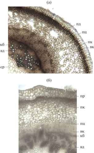 Фрагмент поперечного среза розеточного побега (а) и удлиненного междоузлия верхнерозеточного побега (б) P. maritima в биотопе 3 (увеличение 4×): пр – перидерма, пк – первичная кора, пц – перицикл, вк – вторичная кора, кб – камбий, вд – вторичная древесина, ср – сердцевина (фото К.В. Морозовой).