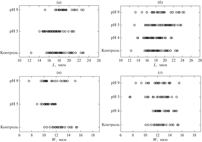 Различия обнаруживаются также при распределении значений длины и ширины клеток (рис. 1). Так, в первой серии опытов наиболее широкий диапазон длины (14–24 мкм) и ширины (7–16 мкм) клеток крови наблюдается при рН 9.0. При этом наиболее высока встречаемость эритроцитов с длиной 18–20 мкм и шириной 10–11 мкм. У головастиков, выращиваемых в кислой среде (рН 5.0), длина и ширина эритроцитов варьируют в меньшем диапазоне 14–21 и 8.5–12.5 мкм соответственно. Наиболее часто встречающаяся длина красных клеток при этом составляет 16–17 мкм, ширина – 11.0–11.5 мкм. То есть в кислой среде намечается тенденция к уменьшению длины эритроцитов и увеличению их ширины, а также уменьшению диапазона распределения.