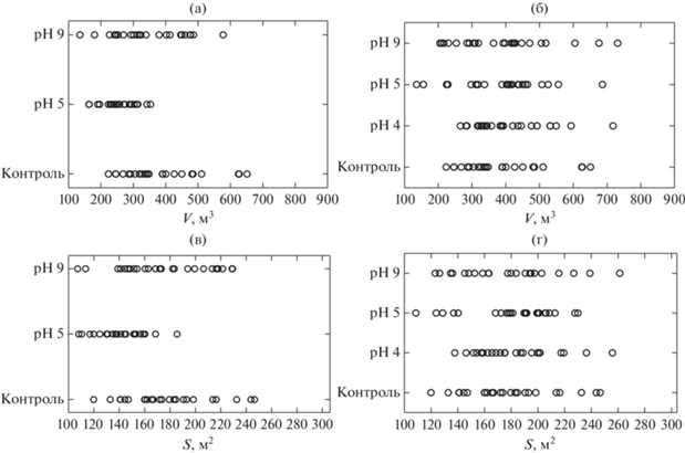 Статистическая обработка данных. Различия между исследуемыми выборками определяли в результате регрессионного анализа данных в программе Excel 10 и Statistica 10. Достоверность различий оценивалась с использованием критерия Стьюдента (t), для выборок с нормальным распределением (р ≤ 0.05). Рассчитывали среднее арифметическое по каждому морфометрическому параметру (Mean и стандартное отклонение SD). Нормальность распределения оценивали критериями Шапиро–Уилка, асимметрии и эксцесса. Для выборок с ненормальным распределением использовали непараметрический критерий Манна–Уитни. Рассчитывали коэффициент корреляции (r) и коэффициент вариации (CV). Влияние разных значений рН на исследуемые параметры у головастиков определяли на основе однофакторного дисперсионного анализа (ANOVA).