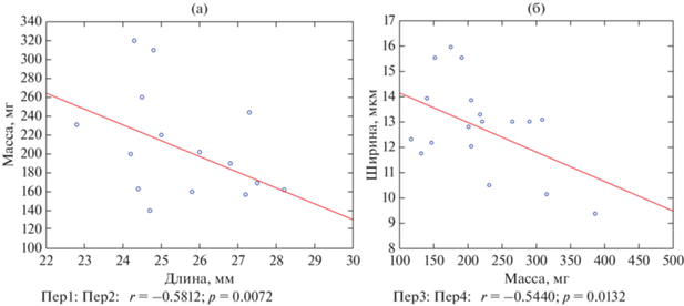 А.К. Дэвис (Davis, 2008b, М. Дас и П.К. Махапатра (Das, Mahapatra 2012) в своих исследованиях указывают на то, что размеры эритроцитов меняются при росте и метаморфозе личинок амфибий. Однако, эта закономерность выявлена без учета воздействия условий среды, в частности, рН. В наших исследованиях масса тела головастиков в обеих сериях опытов увеличивается при рН 9.0 на 22.1–23.7%. Во второй серии при рН 4.0 масса тела, напротив, снижается на 39.5% (р ≤ 0.05), что отражается на данных дисперсионного анализа (см. табл. 2–3). В тоже время изменение рН не оказывает существенного влияния на длину тела личинок малоазиатской лягушки (достоверное снижение на 15.2% отмечено только при рН 4.0 (табл. 2). При этом в первой серии опытов корреляции с размерами эритроцитов не выявлено, тогда как во второй серии отмечена слабая отрицательная связь, (r = 0.5) между массой тела головастиков и шириной при рН 9.0. В остальных случаях средняя корреляционная связь (r = 0.6) обнаружена только при рН 5.0 в первой серии между массой и длиной тела головастиков (рис. 3).