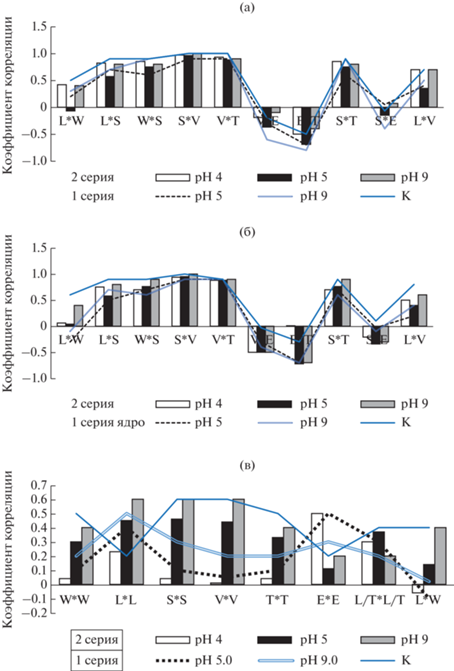 В ходе корреляционного анализа в двух сериях между длиной и шириной эритроцитов и их ядер связь выявлена только в контроле (r = 0.5). Между остальными исследуемыми параметрами отмечены средние (r ≥ 0.5) и высокие (r ≥ 0.8) положительные корреляционные связи, значения коэффициентов которых приближены к контрольным (рис. 4), за исключением отсутствия связи между длиной и объемом ядер. Однако в первой серии при обоих значениях рН (5.0 и 9.0) выявлена отрицательная корреляция между объемом и сферичностью (r = 0.6), а также толщиной и сферичностью (r = 0.7–0.8) эритроцитов (рис. 4а) и их ядер (рис. 4б). Во второй серии между этими же параметрами такой же характер связи отмечается при рН 5.0. Следует отметить, что в контроле эти параметры между собой не коррелируют (рис. 4).