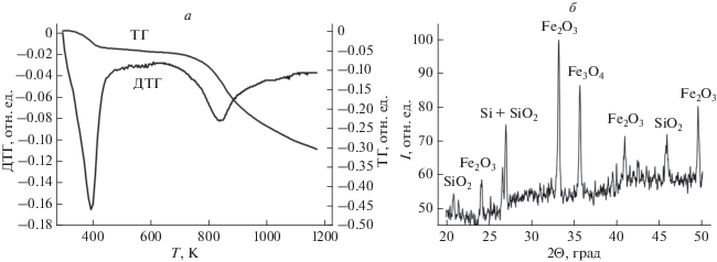 Согласно данным рентгенофазового анализа (рис. 1а), железно-рудный концентрат, используемый для изготовления гранул, на 87% (массовая доля) состоит из оксидов железа, оксида кремния ~6.5% и оксидов других металлов (CaO, MgO, Al2O3, K2O, Na2O) в малых количествах. Рентгендифракционная картина, полученная для готового композитного материала, качественно не отличается от приведенной ввиду малого количества связующего и слабого взаимодействия рентгеновского излучения с лигнином. Данные по элементному составу бентонита, лигнина и композитного материала в целом приведены в работе [11]. Исходя из данных термогравиметрического анализа (при конвекционном нагреве в атмосфере аргона) было выявлено две возможных стадии фазовых превращений (рис. 1б) соответствующих общим процессам дегидратации исходного материала и восстановления железа из оксидов.