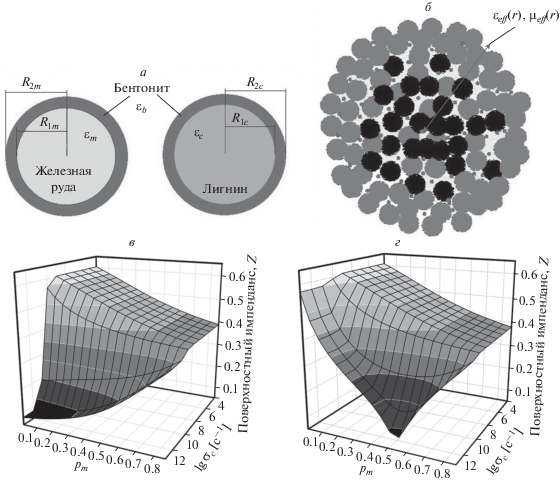Расчет параметров эффективной среды: а – модель частиц в оболочке связующего; б – трех типов частиц; в – зависимость поверхностного импеданса исследуемого материала от объемной доли железной руды и проводимости лигнина для этих моделей; г – зависимость проводимости лигнина для этих моделей.