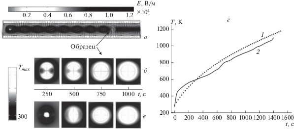 а – Моделирование микроволнового нагрева в прямоугольном волноводе; б – температура внутри гранулы для равномерного распределения железной руды в объеме; в – с уменьшением к поверхности. Сравнение временных зависимостей нагрева гранулы материала, полученных численно (г, 1) и экспериментально (г, 2).