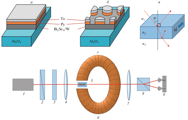Исследованы магнитооптические свойства наноструктур типа W/Py и Bi2Se3/Py. Данные образцы представляют собой структуры W[5 нм]/Py[4 нм]/Ta[1 нм], Bi2Se3[25 нм]/Py[4 нм]/Ta[1 нм] и Cr:Bi2Se3[25 нм]/Py[4–10 нм]/Ta[1 нм] на подложке из сапфира, со сплошным слоем Py (рис. 1а) и с наноструктурированными дисками из Py диаметрами 200 и 500 нм (рис. 1б).